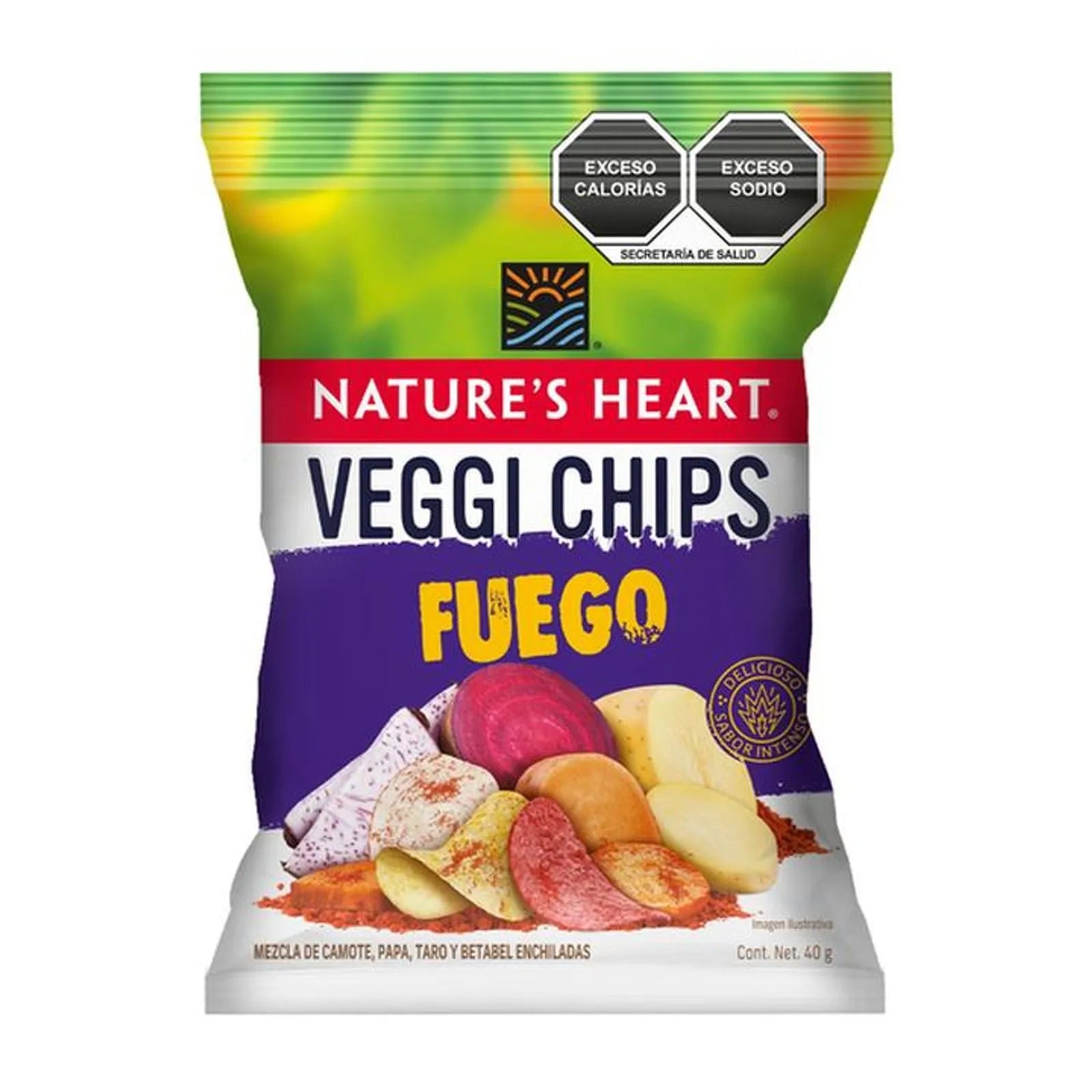Turn up the heat with Nature’s Heart Fuego Veggie Chips in a 1.5 oz bag. Light, crunchy, and spicy.